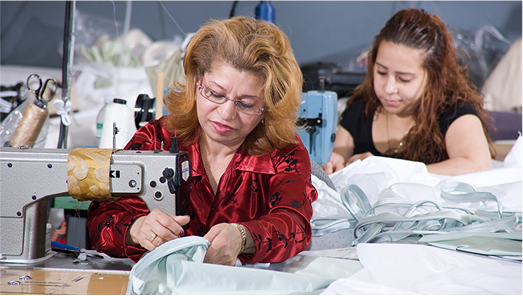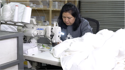 Sewing a comforter closed, carefully and meticulously, for a piece that stands the test of time.