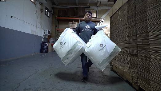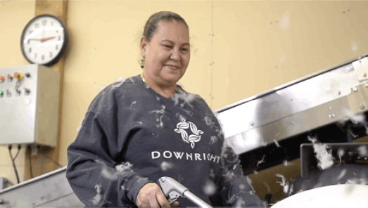 Filling a pillow at our Brooklyn Studio with fluffy clusters of pure, soft, white goose down.